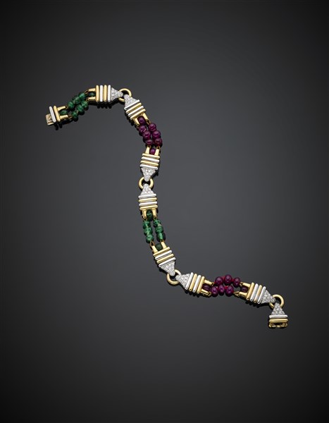 Bracciale modulare in oro giallo e bianco rifinito con diamanti per complessivi ct. 0,80 circa e boules di rubini e smeraldi, g 35,32, lungh. cm 20,40 circa. Firmato e marcato Gianni Carità, 209 NA.