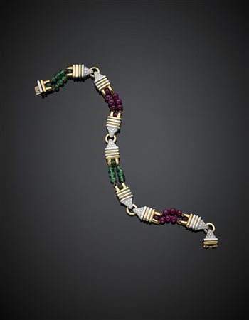 Bi-coloured gold diamond in all ct. 0.80 circa with emerald and ruby bead modular bracelet, g 35.32, length cm 20.40 circa. Signed and marked Gianni Carità, 209 NA.