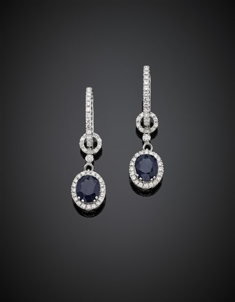 Orecchini pendenti in oro bianco a tenere due zaffiri birmani, rifiniti con diamanti, g 9,37, lungh. cm 3,80 circa.