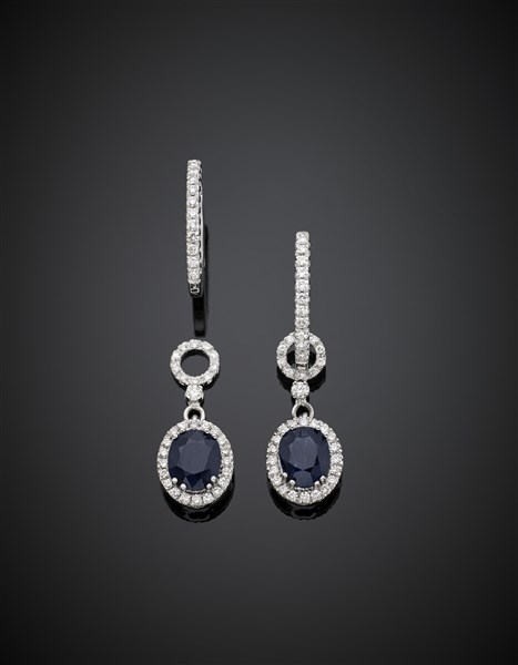 Two Burma sapphire and diamond white gold pendant earrings, g 9.37, length cm 3.80 circa.