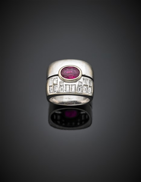 Anello in oro bianco con rubino centrale ovale di ct. 1,80 circa rifinito con diamanti baguette e princess per complessivi ct. 1,00 circa g 19,05 misura 17/57.