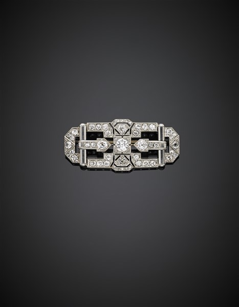 Broche in platino rifinita con diamanti per complessivi ct. 3,00 circa di cui il centrale di ct. 0,50 circa, g 12,29, lungh. cm 4,80 circa.