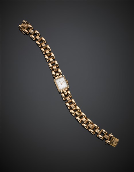 Red gold lady's wristwatch with bracelet, g 46.78, length cm 19.50 circa. On the case abraded swiss mark and number 109, 1186, 348106. (slight defects)