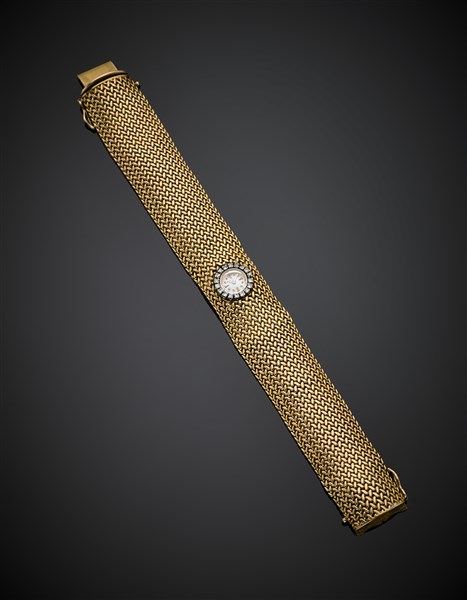 Yellow gold lady's wristwatch accented with diamonds, case n° 817474 A, with gold interwoven bracelet, g 67.19, length cm 19, h cm 2.10 circa. Dial signed Jaeger LeCoultre. (slight defects)