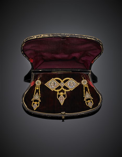 Demi-parure in oro giallo composta da spilla e orecchini con micromosaico, spil