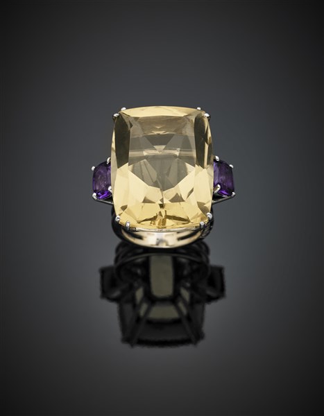 Anello in oro bianco e giallo con un quarzo citrino centrale di ct. 50 circa e due ametiste ai lati per complessivi ct. 3,50 circa, due diamanti rotondi sul gambo, g 27,84 misura 15/55. Firmato e marcato Antonini, 1272 MI. In scatola e confezione originali Antonini