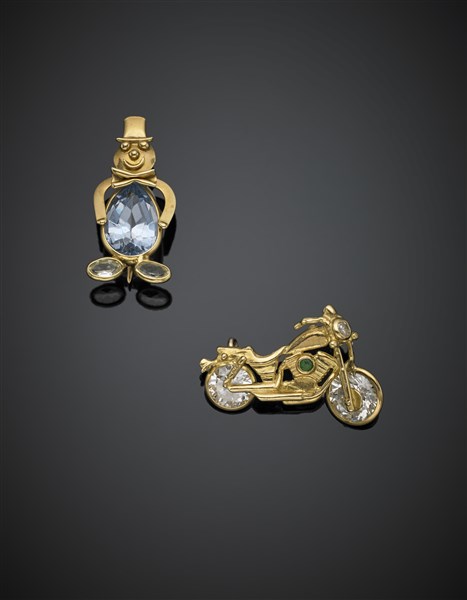 Lotto composto da due piccole spille in oro giallo a guisa di motocicletta e di clown rifinite con paste vitree, complessivi g 6,42. (difetti e mancanze)
