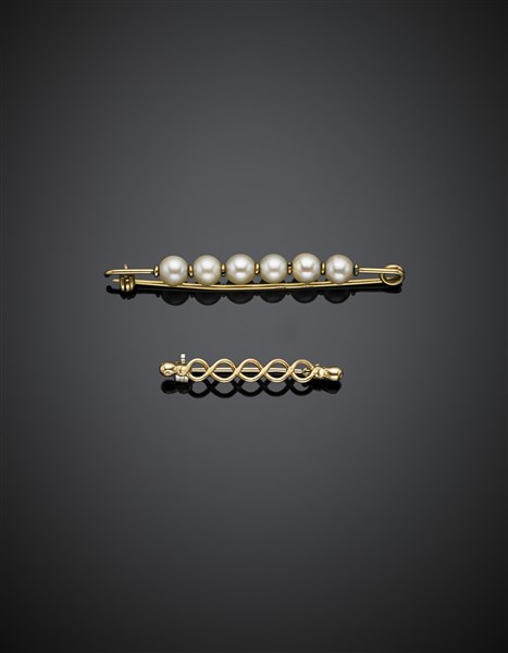 Lot 437 | Lotto di due spille di cui una da balia con perle, complessivi g 4,75, lungh. c