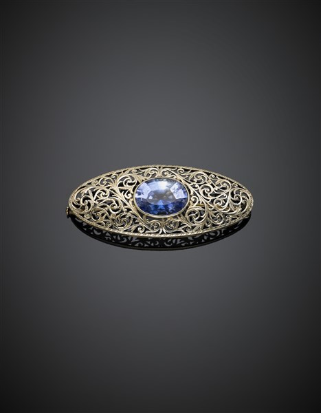 Spilla in oro bianco e giallo con zaffiro sintetico centrale ovale, g 8,28, lungh. cm 5,30, largh. cm 2,80 circa.