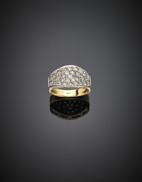 Anello in oro giallo con pavé di pietre incolori, g 7,28 misura 17/57. Marchio