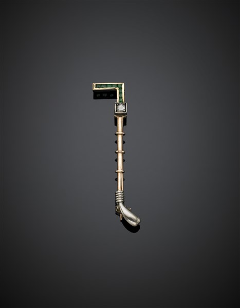 Spilla in oro rosso 333/1000 e argento a guisa di frustino rifinita con smeraldi carré e un piccolo diamante, g 3,12, lungh. cm 4,70 circa.