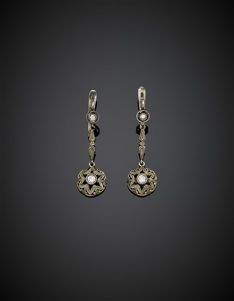 Lot 472 | Orecchini pendenti in oro bianco cesellato e diamanti, g 2,81, lungh. cm 3,40 c