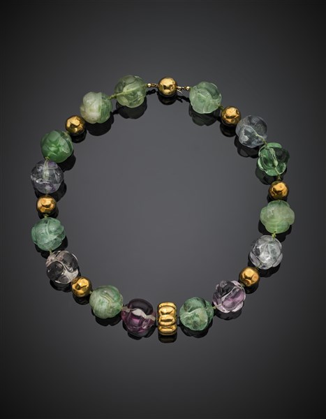 Carved multicolor fluorite and yellow gold bead necklace, g 213.00, length cm 47 circa. (slight defects)