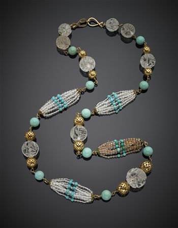 Partly carved hyaline quartz, turquoise and turquoise paste bead necklace with yellow gold clasp and openwork bead spacers, g 171.67, length cm 88 circa. Marked 43 NO.