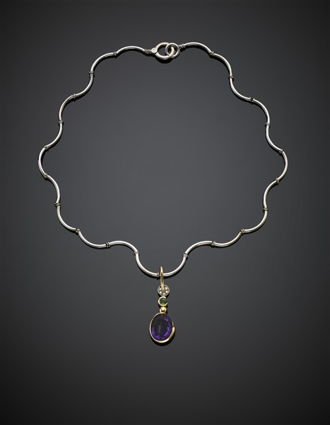 Collier articolato in oro bianco con pendente in oro giallo, ametista ovale e tormalina verde, piccoli diamanti a rifinirlo, g 21,13, lungh. cm 42 circa. Firmato e marcato Manfredi, 390 VA.