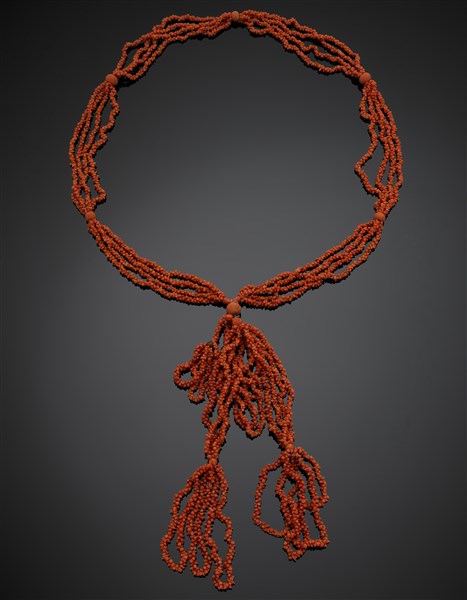 Collana lunga multifilo in corallo arancione irregolare interrotta da boules di corallo incise e terminata da nappe, nella nappa alcuni barilotti non in corallo, g 171,71, lungh. cm 115 circa.
