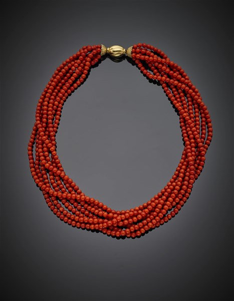 Red coral torchon seven strand bead necklace with yellow gold clasp, bead diam. mm 4.00/4.50 circa, g 101.07, length cm 50 circa.