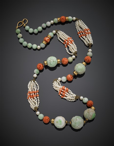Partly carved jadeite and pink coral, pearl long necklace, yellow gold spacers and clasp, g 209.96, length cm 93 circa.