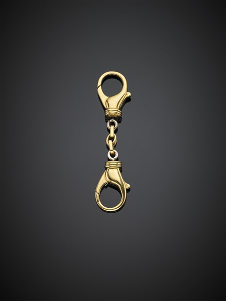 Portachiavi in oro giallo terminato da due moschettoni, dettagli in oro bianco,