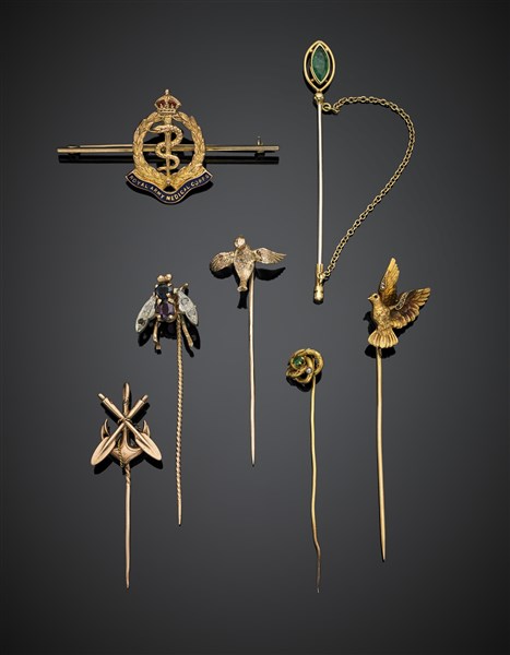 Lotto in oro giallo, rosso 333/1000 e argento composto da sei spilloni e una spilla in oro da 333/1000 a 750/1000, rifiniti con gemme varie e smalti, complessivi g 21,48.
