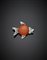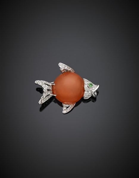 White gold diamond and cabochon carnelian globe fish pendant/brooch, a green stone for the eye, in all ct. 0.50 circa, g 13.88, length cm 3.50, width cm 3 circa. Signed Femini, 2881 AL.