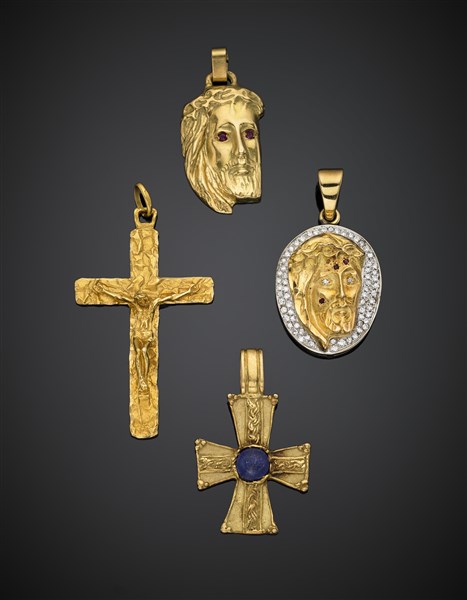 Yellow gold lot comprising four holy symbols accented with diamonds, rubies and a reconstructed lapis, in all g 50.00. (slight defects)