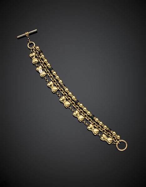 Yellow gold three strand bracelet with green, pink and violet stones, g 31.66, length cm 19.10 circa. Signed and marked Celin, 1110 VI.