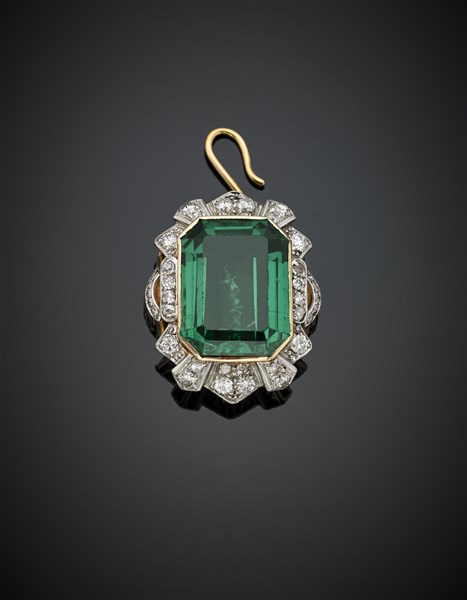 Pendente in oro giallo e argento rifinito con spinello sintetico verde e diamanti per complessivi ct. 1,30 circa, g 11,53, lungh. cm 4,20 circa.