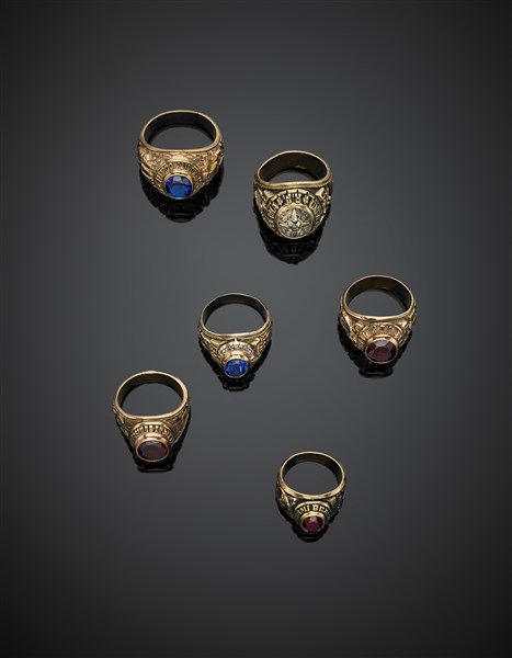 Lotto composto da sei anelli in oro cesellato da 333/1000 a 585/1000 giallo, rosso e paste vitree, complessivi g 60,79. (lievi difetti)