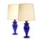 COPPIA DI LAMPADE ELETTRIFICATE Germania fine del XIX Sec. In opalina blu cobalto con bruciatori Kosmos-Brenner, complete di paralumi in tessuto H. 90 cm.