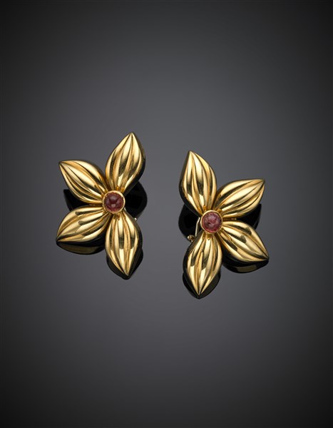 Orecchini in oro giallo a guisa di foglie scanalate centrate da gemme rosa cabochon, g 29,14, lungh. cm 5,20, largh. cm 3,30 circa. Firmati e marcato Gemma Gioielli, 169 VR.