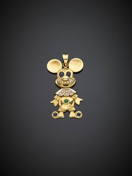 Pendente a forma di topolino snodato in oro giallo e bianco rifinito con diamanti, zaffiri cabochon e smeraldo cabochon, g 16,19, lungh. cm 4,50 circa.