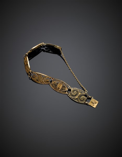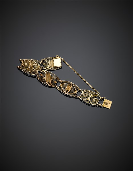 Bracciale in filigrana d'oro a losanghe, g 19,54, lungh. cm 17,50 circa. Marchio in losanga non noto.