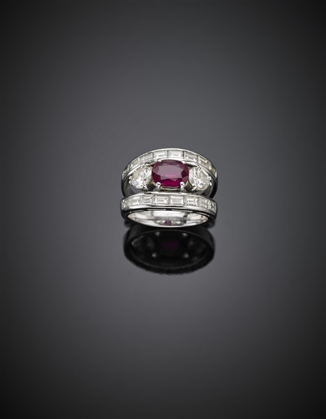 Anello in oro bianco con doppietta centrale di rubino sintetico e vetro e diamanti rotondi e calibré per complessivi ct. 2,60 circa, i due maggiori l'uno di ct. 0,48 circa cadauno, g 9,11 misura 10/50.