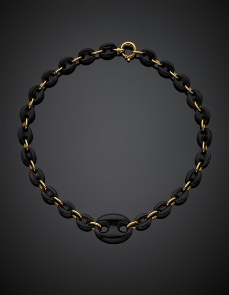 Collier a scalare a catena marinara in oro giallo e bachelite, g 27,34, lungh.