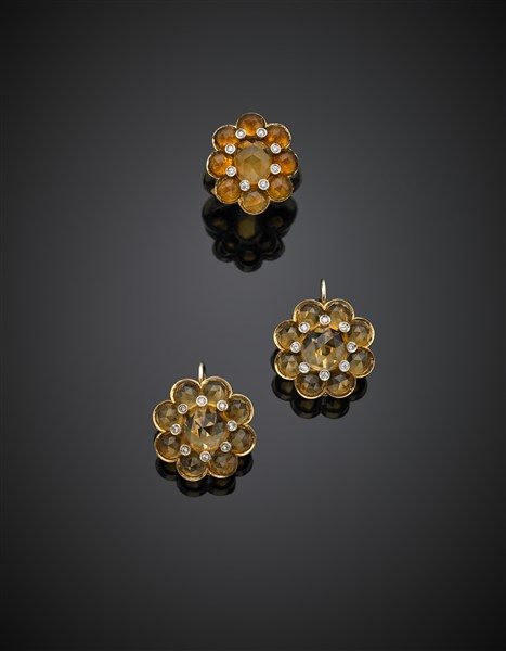 Yellow gold rose cut citrine quartz and diamond jewelry set comprising ring, size 17/57, and earrings of cm 2.70 circa, in all g 24.73. On the ring Atelier Illario in italic, all marked 1977 AL, CIF.
