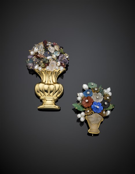 Lotto di due spille a vaso fiorito in oro giallo e gemme in parte scolpite, una