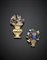 Lotto di due spille a vaso fiorito in oro giallo e gemme in parte scolpite, una