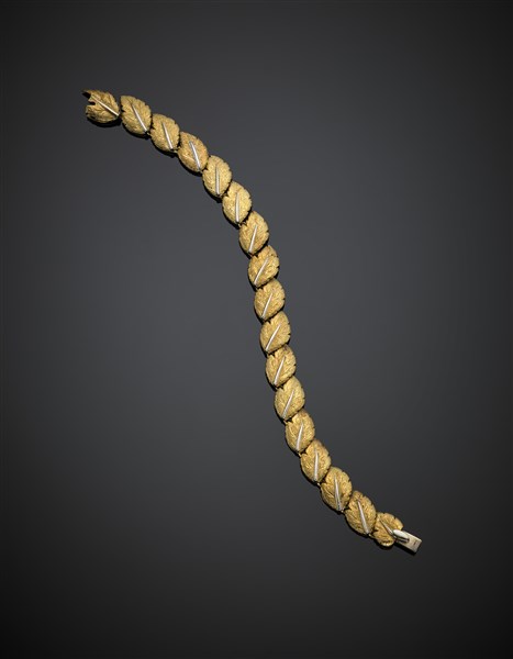 Bracciale in oro giallo e bianco in parte cesellato a guisa di foglie, g 29,45, lungh. cm 19 circa.