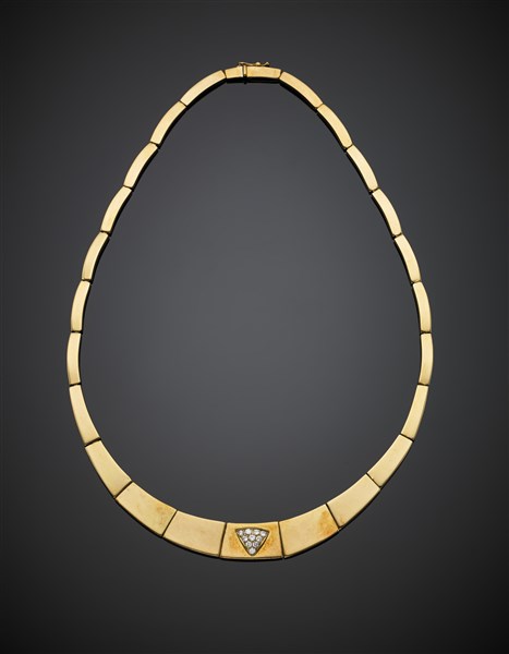 Yellow gold articulated modular necklace with small diamond pavé, in all ct. 0.50 circa, g 45.32, length cm 45 circa. Signed and marked Quadri, 544 VI.