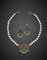 Demi-parure in oro giallo, perle coltivate, rubini, smeraldi e zaffiro cabochon composta da collier e orecchini pendenti con clip, lungh. collier cm 41 circa, orecchini cm 4.5 circa, dettagli in oro bianco, complessivi g 57,23.