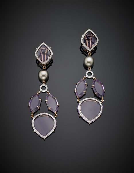 Orecchini pendenti con perno e clip in oro rosa, ametiste flat e perle grigie rifiniti con diamanti, g 30,32, lungh. cm 9 circa.
