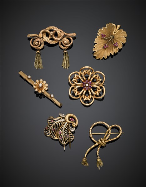 Lot of four bi-coloured gold and two yellow 9K gold brooches, in part accented with rubies, pearls and diamonds, in all g 58.37. Marked 225 AL, 240 AL.