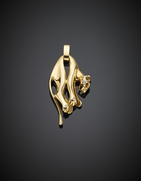 Pendente a pantera in oro giallo e piccoli diamanti a rifinirlo, g 25,37, lungh. cm 5,30 circa.
