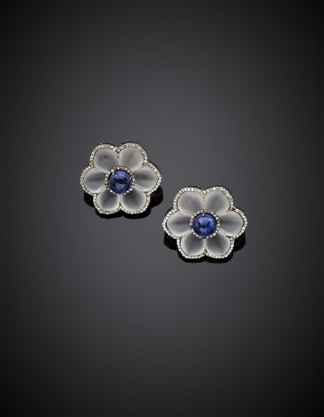 Hyaline glazed quartz and cabochon tanzanite silver and gold flower earrings, g 17.66, length cm 3 circa.