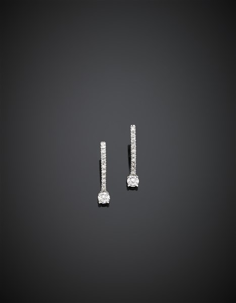 Orecchini pendenti in oro bianco e diamanti rotondi per complessivi ct. 0,60 circa, g 3,11, lungh. cm 2,20 circa.