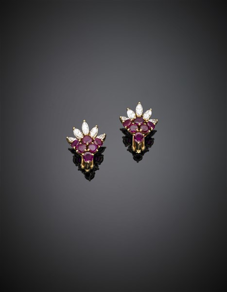 Yellow gold marquise diamond in all ct. 1.20 circa and round ruby earclips, g 11.30, length cm 1.50 circa. Marked 639 MI.