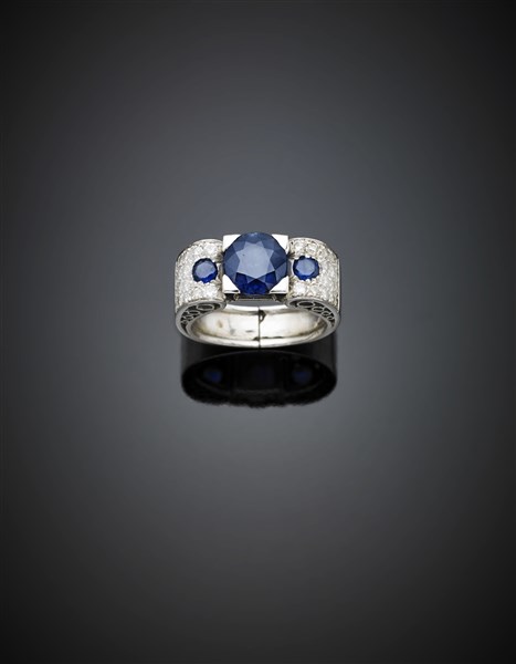 Three round sapphire and diamond pavé platinum ring, central sapphire in all ct. 2.80 circa, diamonds in all ct. 0.65 circa, g 10.62 size 15/55.