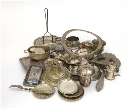Cartone contenente numerosi oggetti in argento, lamina d'argento e metallo (g l