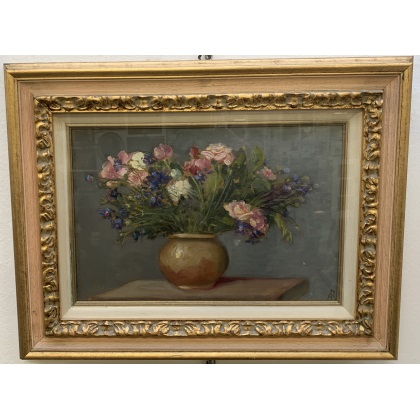 Ignoto ''vaso con fiori'' olio su cartoncino (cm 30x45) siglato in basso a destra, in cornice (lievi difetti)